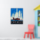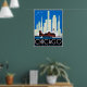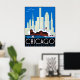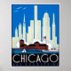 Un paisaje vintage de Chicago en un poster de reproducción restaurado. Edificios estilizados en el fondo y bandera americana ondeando el Fuerte Dearborn. Aviones imaginarios sobrevolando.
