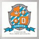 Escudo estilo caballeros con cresta de letra D arte de monograma de nombre cartel perfecto para el dormitorio o sala de juegos de un niño en tonos de naranja, azul teal, blanco y gris. Personalice con el nombre de su hijo y el significado del nombre para un toque personalizado en el dormitorio o guardería de su hijo, este ejemplo es para el nombre Dakota Un amigo y aliado. Valiente, fiable y digno de confianza. Impresión de cartel ideal como regalo para un recién nacido, bautizo, nombre de bebé, cumpleaños de niño o regalo para baby shower. Arte gráfico y diseño único de escudo de heráldica dibujado por Sarah Trett. www.sarahtrett.com para www.mylittleeden.com
