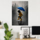 A child in a yellow raincoat and boots holds a bright blue umbrella, joyfully stepping through puddles in a rainy cityscape. The silhouette contrasts against the muted background, conveying a sense of innocence and fun.