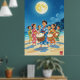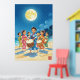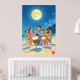 This painting by Kagu depicts a joyful scene of several young, Asian children gathered on a beach at night. They are dressed in traditional Japanese-style kimonos with floral patterns, varying in colors like pink, blue, green, and orange. The central figure, a boy in a blue kimono, is actively playing a large drum, and several other children around him also hold and appear to be playing smaller drums.