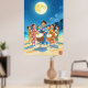 Above them, a prominent, large, bright yellow full moon illuminates the dark blue night sky, which is dotted with numerous small stars. The background features the ocean with gentle waves lapping at the shore on the left, and hints of distant land or trees on the right. The overall style is reminiscent of an animated or illustrative children's storybook, characterized by clear lines, vibrant colors, and a whimsical, serene atmosphere.