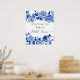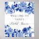 "Letrero de Despedida de Soltera Chinoiserie Azul y Blanco." Diseño de estilo chinoiserie chino en azul marino, azul y blanco tiene interpretaciones estilizadas de flores, follaje, ramas de árboles y un pájaro cantor que enmarca el texto para dar la bienvenida a sus invitados para la Despedida de Soltera de una novia muy especial. La obra de arte fue pintada por Audrey Jeanne Roberts, una artista y diseñadora licenciada internacionalmente, derechos de autor.