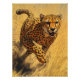 Un poderoso chita se esparce por la sabana a toda velocidad, capturado en una visión cercana y detallada. Su abrigo elegante y manchado se extiende con cada tira potente, los músculos enrojecidos y tensos. Los ojos intensos del chita son agudos y concentrados, encarnando el poder crudo de un depredador en movimiento. Su cuerpo está completamente extendido, garras excavando en la tierra. Las hierbas doradas borrosas en el fondo enfatizan la forma del chita, iluminada por la cálida luz dorada del sol de la sabana, añadiendo profundidad e intensidad a la escena.