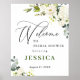 Bienvenidos invitados a su boda con Póster de bienvenida para despedida de soltera con flores blancas y vegetación floral, con vegetación botánica de acuarela exuberante y flores blancas, con "bienvenidos a nuestro felices para siempre", sus nombres y fecha de la boda en una mezcla elegante de tipos modernos de letra de bloque y caligrafía manuscrita.