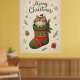 A festive illustration features a cute tabby cat wearing a Santa hat, nestled inside a green and red Christmas stocking. The stocking is decorated with traditional patterns. Above the cat, the words "Merry Christmas" are written in a decorative script. The background is a soft beige color, adorned with stars, dots, and sprigs of greenery.