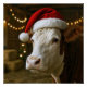 A charming portrait of a Hereford cow donning a festive Santa hat, in a barn adorned with twinkling holiday lights, radiates the joyful spirit of the season