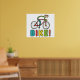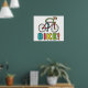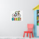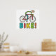 El diseño ciclista de ciclismo muestra a un ciclista de garrotes geniales montando una bicicleta de carreras a toda velocidad con grandes letras BIKE debajo. Gráfica de ciclismo dibujada a mano para peatones entusiastas.