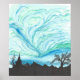 acuarela azul y verde y tinta negra sobre lienzo que representa un paisaje de silueta.