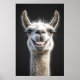 Un acercamiento muy detallado de una llama blanca sonriente con ojos expresivos y una expresión cómica y amigable en un entorno oscuro.
