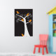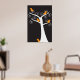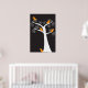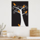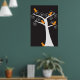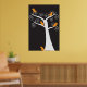 Cinco adorables pájaros naranjas abstractos cuelgan en un árbol blanco sobre un fondo negro en un poster