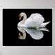 Fotografía de un cisne blanco con reflexión sobre un fondo negro.