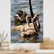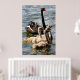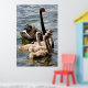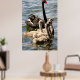 Un cisne negro vigila a sus jóvenes cignets en un lago a última hora de la tarde