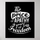 Una cita inspiradora sobre la apatía y la pérdida de nuestras libertades con letras blancas mostradas en una disposición tipográfica artística sobre un fondo negro puro que puede personalizar al color de su elección.