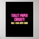 Añada un toque de humor y luminosidad a la decoración de su cuarto de baño con nuestra llamativa imagen en la pared que incluye la frase "¿Crisis de papel higiénico? ¡Marca 1-800-WIPE-NOW!" Este ingenioso diseño sirve como un recordatorio juguetón de la infame escasez de papel higiénico que experimentamos. La tipografía audaz y los colores vivos la convierten en una pieza destacada en cualquier baño. Esta impresión, elaborada con materiales de alta calidad, es duradera y fácil de colgar. Es una adición perfecta para crear una atmósfera divertida y peculiar, mientras que se pone una sonrisa en los rostros de los clientes. Acepte el humor y convierta su baño en un punto de partida de conversación con esta única huella de pared.