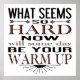 Sorprendente y moderno, esta cita está diseñada usando tipografía atrevida y gráfica. La cita dice "Lo que parece tan difícil ahora algún día será tu calentamiento" y está impresa en negro con acentos de rojo y rosa. Sólo las palabras para inspirarte a trabajar más duro y motivarte hacia tu meta.