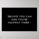 Poster de citas motivacionales que presenta "créanme que puedes y estás a medio camino" en la moderna y minimalista tipografía de máquina de escribir en blanco y negro.