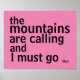 Esta cita de Muir poster negrita texto negro sobre un fondo rosado en un estilo minimalista moderno con comillas que las montañas están pidiendo arte mural para la decoración en casa o en la oficina.