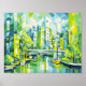 pintura cubista única de una exuberante ciudad verde con un puente moderno sobre un canal. Las formas geométricas y los tonos vivos realzan el ambiente urbano dinámico.