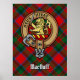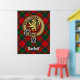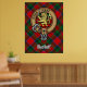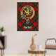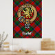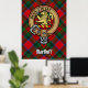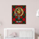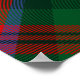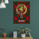 Insignia escudo del clan MacDuff rodeada por una correa y hebilla sobre fondo tartán. Texto personalizado.