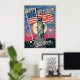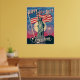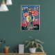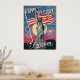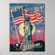 La estatua de la Libertad se exhibe de forma destacada en el centro. Una vibrante bandera estadounidense ondeando en el fondo con fuegos artificiales ardiendo a su alrededor. "¡Feliz 4 de julio!" en negrita, estilo vintage en la parte superior, con "Celebrar la libertad" en un guión más pequeño y elegante debajo. Tradicional rojo, blanco y azul, con un toque ligeramente anticuado y vintage.