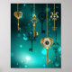 El oro, las llaves antiguas con engranajes y diales cuelgan de las cadenas de oro sobre un fondo verde luminoso.