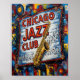 Poster de alta calidad de un colorido diseño de arte acrílico que presenta el marco del centro de un club de jazz de Chicago con saxofón, notas musicales y fondo abstracto en amarillo, azul y rojo.