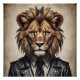 Un león caprichoso llamado Clyde con corbata y chaqueta.