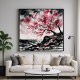 Artwork of cherry blossoms on a windy cliff side shoreline. Ancient trees painted with definitive black ink strokes, clings to a wave-swept, fractured cliff. A turbulent, inky sea crashes below. In a striking contrast, the tree erupts in a storm of vibrant crimson and magenta blossoms, with petals scattering against the dark, dramatic sky. A commanding piece of contemporary art about resilience and ephemeral beauty. The massive, dark ink wash formations of rock and wave seem to clash with the fragile, scattering petals, creating a scene that is both melancholic and triumphant. For the viewer who understands that beauty is often found at the edge of chaos.
