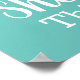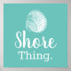 Cute and stylish coastal/beachy seashell poster in white and sea green featuring the phrase "shore thing" in script.