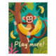 Un mono de dibujos animados alegre abraza un plátano mientras trepa a un árbol, rodeado de hojas tropicales y la frase animada “¡Juega más!” para decoración de habitación y aula de niños animados en colores cálidos y amigables y estilo de ilustración texturizada que aumenta la energía positiva. Las palabras únicas y descriptivas y las palabras clave enfocadas se alinean con las pautas de metadatos de Zazzle para una mejor detección.