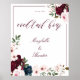 Elegante y moderno cartel de boda de la hora del cóctel con la "hora del cóctel" diseñada en un estilo de guion elegante y moderno que se complementa con gusto a nuestros florales de color burdeos y marina que enmarcan las esquinas. Personalice con nombres y fecha de boda. Todas las flores pintadas a mano por Moodthology Papery.