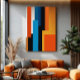 Esta pieza abstracta presenta bloques verticales en tonos vibrantes de naranja, azul, negro y blanco, creando una composición armoniosa y llamativa. Perfecta para espacios modernos, irradia energía y equilibrio a través del color y la geometría.
