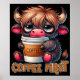 A funny and sarcastic design showcases a cute highland cow holding a to-go coffee cup brimming with coffee. With big blue eyes and a sleepy, tired expression, the cow rests its head on the cup's lid, its fluffy black fur adding to the charm. The colorful text reads, "Coffee first." This playful design is available on a wide variety of products, making perfect gifts for coffee lovers.