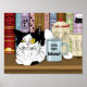 El gato de esmoquin blanco y negro se despierta en un mostrador de cocina con sus libros para cocinar, tazas para café, azúcar y crema.