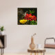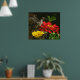 Este poster presenta un colibrí hembra gaviota. Se atrapa en el aire mientras bebe néctar del centro dorado de una flor de zinnia roja brillante. Cerca hay una flor de zinnia amarilla. Los colores parecen brillantes con el fondo de hojas verdes y sombras oscuras.