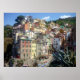 Poster de Riomaggiore, Cinque Terre, Italia. Riomaggiore (Rimazùu en la lengua local de Liguria) es un pueblo y comune en la provincia de La Spezia, situado en un pequeño valle en la región de Liguria de Italia. Es la primera de las Cinque Terre que se encuentra cuando se viaja al norte de La Spezia. El pueblo, que data de principios del siglo XIII, es conocido por su carácter histórico y su vino, producido por los viñedos de la ciudad. El Riomaggiore está situado en la región de Riviera di Levante, en el golfo mediterráneo de Génova, con una pequeña playa y un embarcadero enmarcado por torres.