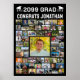 Celebra tu graduación con una muestra de recuerdos de fotos a través de los años impresos en una poster con esta plantilla de collage de fotos fácil de subir con 59 imágenes cuadradas y rectangulares para acomodar una variedad de temas de fotos. El diseño presenta el texto personalizado en su elección de estilos de fuente y colores (mostrados con un guión moderno de caligrafía en blanco) acentuados por tapones de graduación o morteros y diplomas con un color de fondo editable. Todos los colores de texto y gráfico se pueden cambiar a colores de temas escolares o fiestas. Hace una gran decoración en una fiesta de graduación y de recuerdo conmemorativo. OPCIONES: El ejemplo se muestra en un tamaño de XXxXX" en papel de valor (mate); en la página de pedidos están disponibles otros tamaños de impresión estándar y personalizado y calidad de papel, archivo de descarga digital instantánea para imprimir localmente o transferir el diseño a un tablero de espuma, banner, lienzo u otras opciones de producto. CONSEJO DE TAMAÑO: Elija Tamaño de Personalizado para bordes pares cambiando la altura y el ancho proporcionalmente DESPUÉS de hacer clic en el icono DESBLOQUEAR (parece un enlace de cadena). ASISTENCIA: Para obtener ayuda con la modificación o personalización del diseño, el cambio de color, el cambio de tamaño o la transferencia del diseño, póngase en contacto con el diseñador ANTES DE ORDENAR a través de la pestaña MENSAJE de chat de Zazzle o envíe un correo electrónico a makeitaboutyoustore@gmail.com.