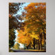 El poster "Country Colours in Autumn" es una imagen pacífica de un follaje brillante en los altos árboles de arce en una carretera rural en un hermoso día soleado.