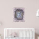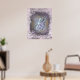This is a drawing of a ballerina in a grand jete jump. It is in blue, lavender and pinks and it has a light pink lacy border with butterflies and flowers.