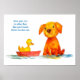 Perro cómico color agua parado en el agua, mirando a un pato sentado en un pequeño bote rojo. Escena animal divertida y encantadora llena de contraste, curiosidad y calidez.