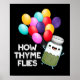 How Thyme Flies Funny Herb Pun presenta una botella de tomillo que vuela con globos de colores . Perfecto regalo de juego de palabras para la familia y los amigos que aman los juegos de hierba tima.