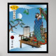 Esta elegante obra de arte japonesa estilo bloque de madera ofrece una interpretación contemporánea del arte tradicional ukiyo-e, con un gato siamés vestido con un sofisticado kimono azul con intrincados patrones geométricos y florales. La ropa está adornada con vibrantes diseños circulares y se acentúa con ricos detalles rojos, lo que crea un impresionante contraste con el azul celeste. La escena se encuentra en una veranda de madera (engawa) con un farol japonés tradicional en primer plano. A la distancia, el Monte Fuji se eleva majestuosamente bajo una luna llena, mientras que las ramas de pino con agujas detalladas se extienden grácilmente a través de la parte superior de la composición. La obra de arte captura con maestría la serenidad de una velada a la luz de la luna en el Japón tradicional. La pieza incluye elementos clásicos ukiyo-e como el cartucho amarillo en forma de ventilador en la parte superior izquierda que contiene caracteres japoneses, y un sello circular rojo con kanji en la parte inferior izquierda. La composición muestra el equilibrio característico y la atención al detalle que se encuentra en las impresiones tradicionales japonesas, al tiempo que incorpora elementos modernos y caprichosos a través de su tema felino. La paleta de colores es particularmente refinada, dominada por varios tonos azules tanto en el cielo como en el kimono, complementada con tonos marrones de la estructura de madera y toques de rojo en los detalles de la ropa. El conjunto crea una armoniosa mezcla de técnicas artísticas tradicionales japonesas con sensibilidades contemporáneas, lo que lo convierte en una pieza sofisticada para espacios interiores modernos y tradicionales. Esta obra de arte une con éxito la brecha entre el arte clásico japonés y la estética moderna, ofreciendo una pieza de conversación única que rinde homenaje a la tradición ukiyo-e y al mismo tiempo atrae a los gustos contemporáneos.