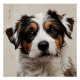 Un retrato encantador de un pastor australiano, con sus ojos expresivos y vibrante pelaje en tonos negros, blancos y marrones. La luz suave resalta su energía e inteligencia, capturando la esencia leal y juguetona de esta querida raza.