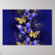 Composición de lujosas mariposas de zafiro y joyas de oro sobre fondo de textura azul.