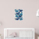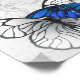 Composición vertical de mariposas morfo realistas, azules y blancas sobre fondo texturado gris. Mariposa morfo azul.