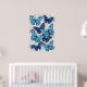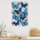 Composición vertical de mariposas morfo realistas, azules y blancas sobre fondo texturado gris. Mariposa morfo azul.