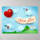 Globo en forma de corazón y mensaje volando sobre el campo, arte digital