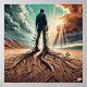 Una poderosa y estimulante obra de arte que representa a una figura humana parada en un paisaje árido, pero en lugar de piernas, tienen profundas e intrincadas raíces que crecen en la tierra. El contraste entre el suelo seco, rajado y las hojas verdes emergentes simboliza la resiliencia, la transformación y la conexión intrínseca entre la humanidad y la naturaleza. La luz solar que atraviesa las nubes despierta esperanza y renovación, haciendo de esta pieza una profunda metáfora visual para el crecimiento y la pertenencia.