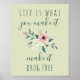 Poster de Concienciación contra las Drogas. El mensaje de 'no a las drogas' se sienta en un suave fondo verde y dice "La vida es lo que haces. Hacerlo libre de drogas". El lema está escrito en letra elegante con letras a mano y tipografía en mayúsculas. El poster está decorado con una acuarela floral de flores color rosa bonito y marfil.
