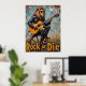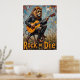 Este impresionante cuadro capta un majestuoso león, adornado con gafas de sol y una chaqueta de cuero, que lleva su himno de rock en una guitarra eléctrica. Está sentada confiadamente sobre una vieja rueda de madera en un campo cubierto de sol. El uso de brochas audaces y texturadas por el artista enfatiza el encanto escarpado del lugar y la actitud de "Rock or Die", dando vida al inesperado concierto.